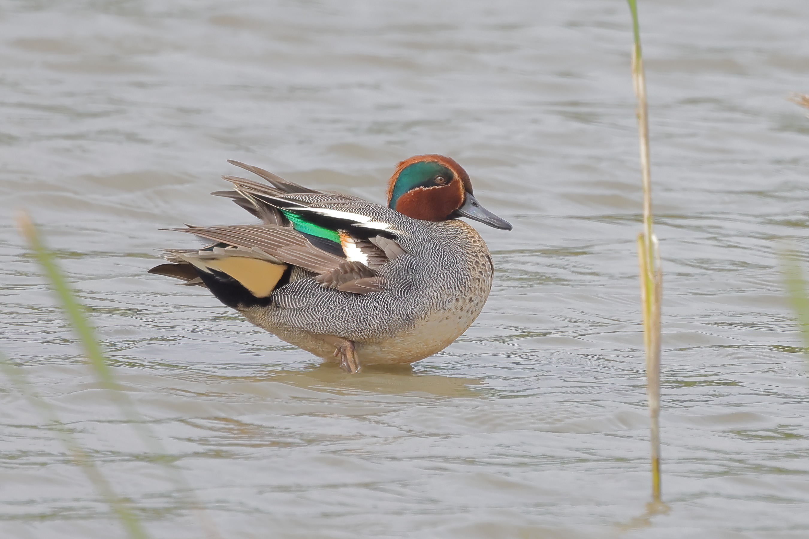 小水鴨雄鳥栗紅色的臉上有一道綠色彎月型過眼帶,